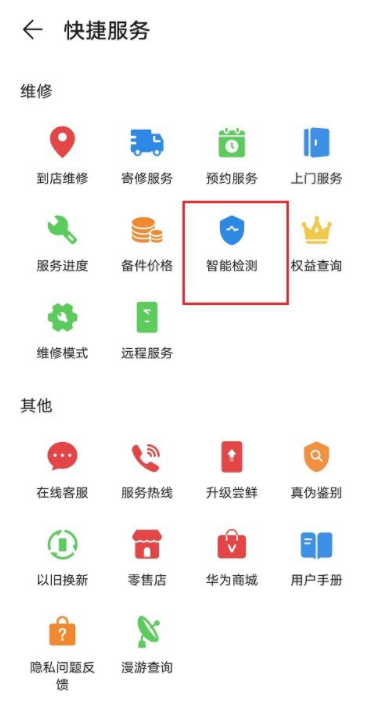 打开快捷服务功能,如图,点击【维修】——【智能检测】,