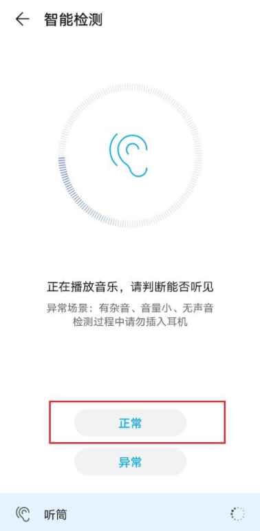 进入智能检测界面,点击【立即检测】,等待一会儿,系统开始检测手机听筒(正在播放音乐,判断能否听见),如果正常,点击【正常】,