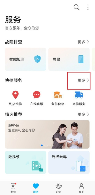 打开华为手机,在桌面点击【服务】应用,进入页面,选择【快捷服务】——【更多】,