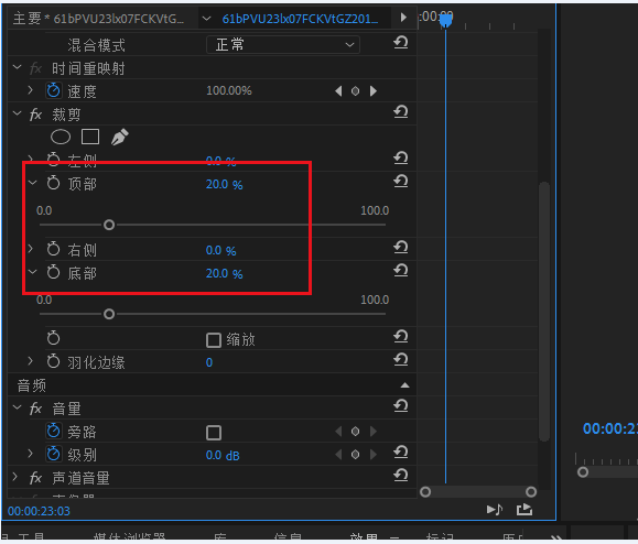 在上方工具栏点击【效果控件】,找到裁剪,点击【顶部】和【底部】,进行数据调整,可以直接输入数字,