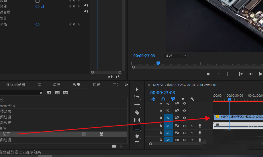 点击裁剪效果,鼠标按住不放,将其拖放至视频中,