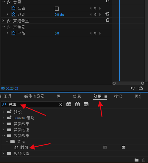 在左侧窗口中点击【效果】,搜索【裁剪】,选择【变换】——【裁剪】,