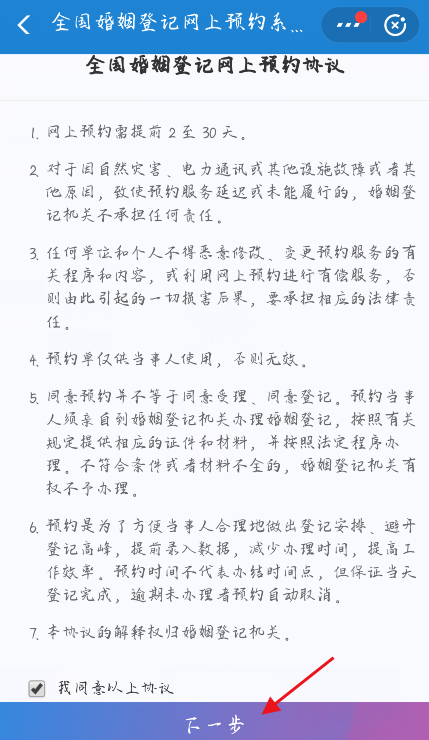 选择结婚预约,认真阅读预约协议,点击下一步,