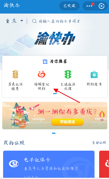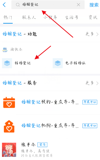 打开手机支付宝,进入首页,直接搜索【婚姻登记】,每个城市都有对应的民政服务,选择对应城市的婚姻登记功能,下面就以重庆渝快办为例。