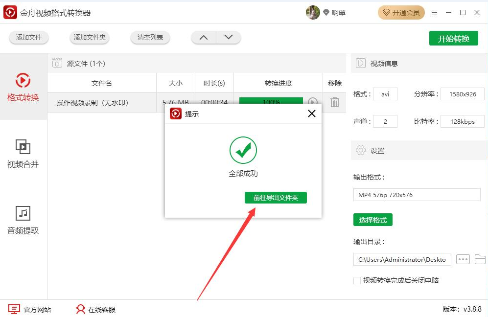 7、最后,弹出如下图的小窗口提示,则说明金舟视频格式转换器成功地将AVI转MP4。我们点击“前往导出文件夹”按钮,就可以快速找到转换后的MP4视频了。