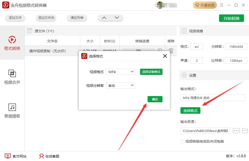 3、然后,回到金舟视频格式转换器,点击界面右侧的“选择格式”按钮,同时,在弹出的小窗口中选择“MP4”的视频格式,并根据自己的需要选择视频分辨率,再点击“确定”按钮。