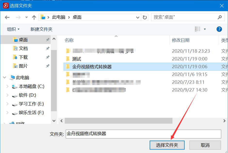 5、在金舟视频格式转换器弹出的窗口中,我们选择AVI转MP4后的视频保存路径,再点击“选择文件夹”按钮。