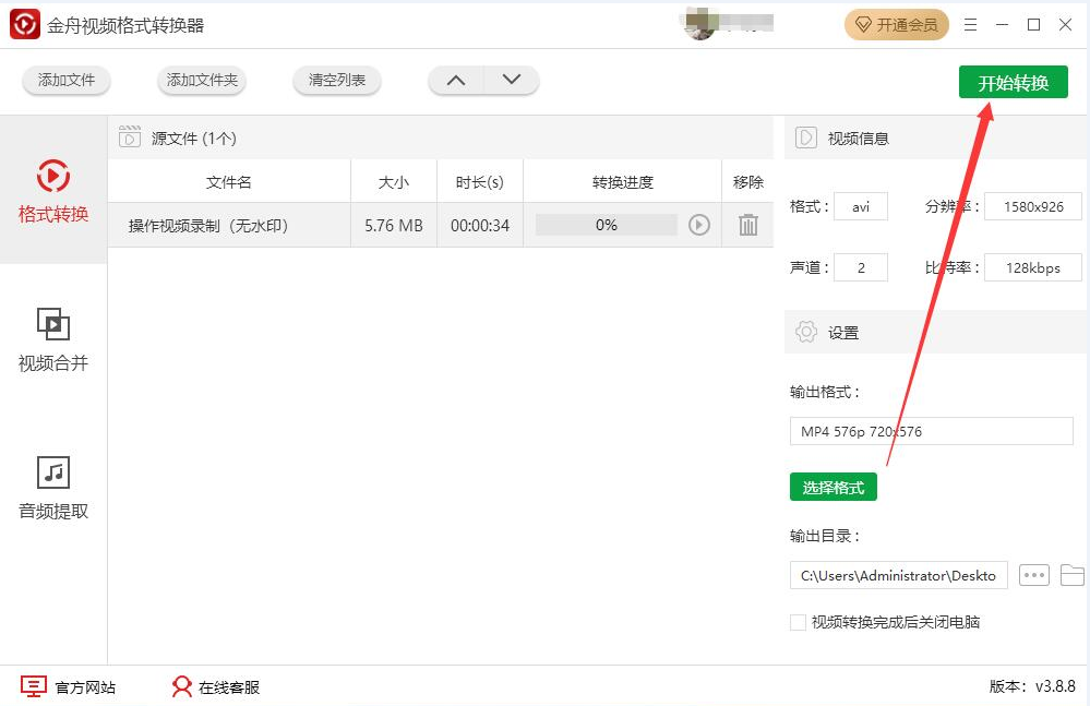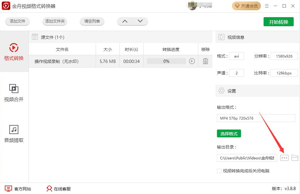 6、AVI转MP4的格式和路径都设置好了后,我们点击界面右上方的“开始转换”按钮,金舟视频格式转换器便开始将AVI转MP4。