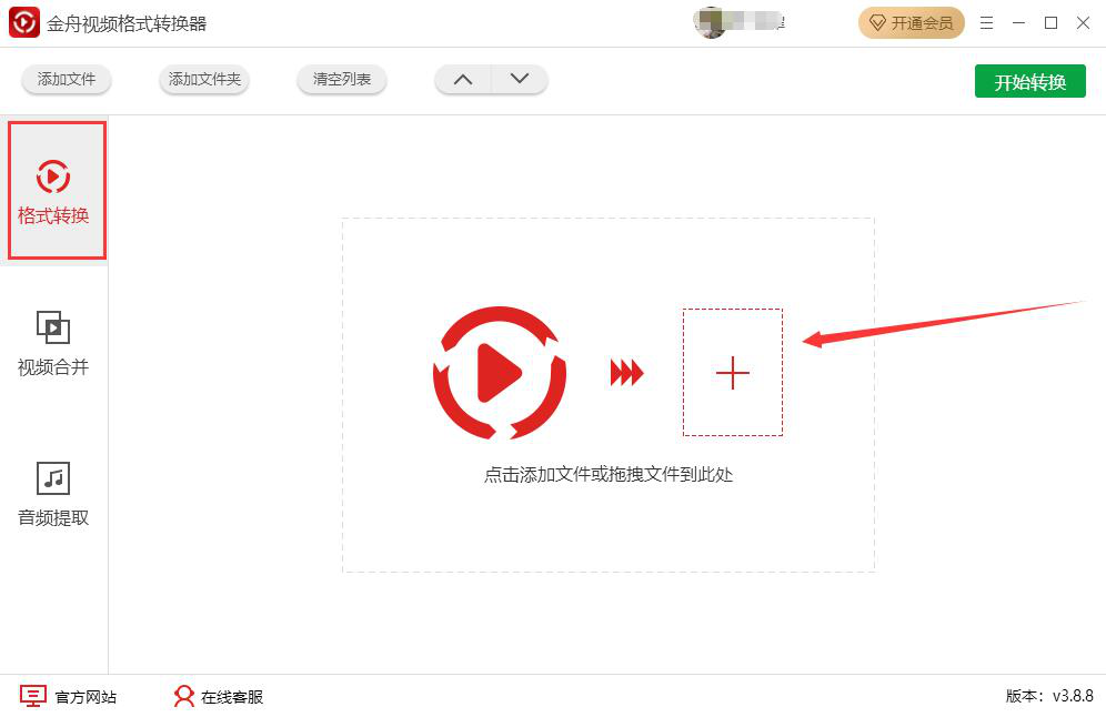1、首先,我们打开金舟视频格式转换器,先切换至“格式转换”操作界面,并点击界面中部的“+”按钮。