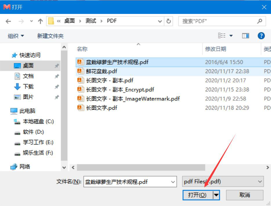 2、在弹出的窗口中,选择需要抽取页面的PDF文件,点击“打开”按钮,将其导入迷你PDF转Word软件。