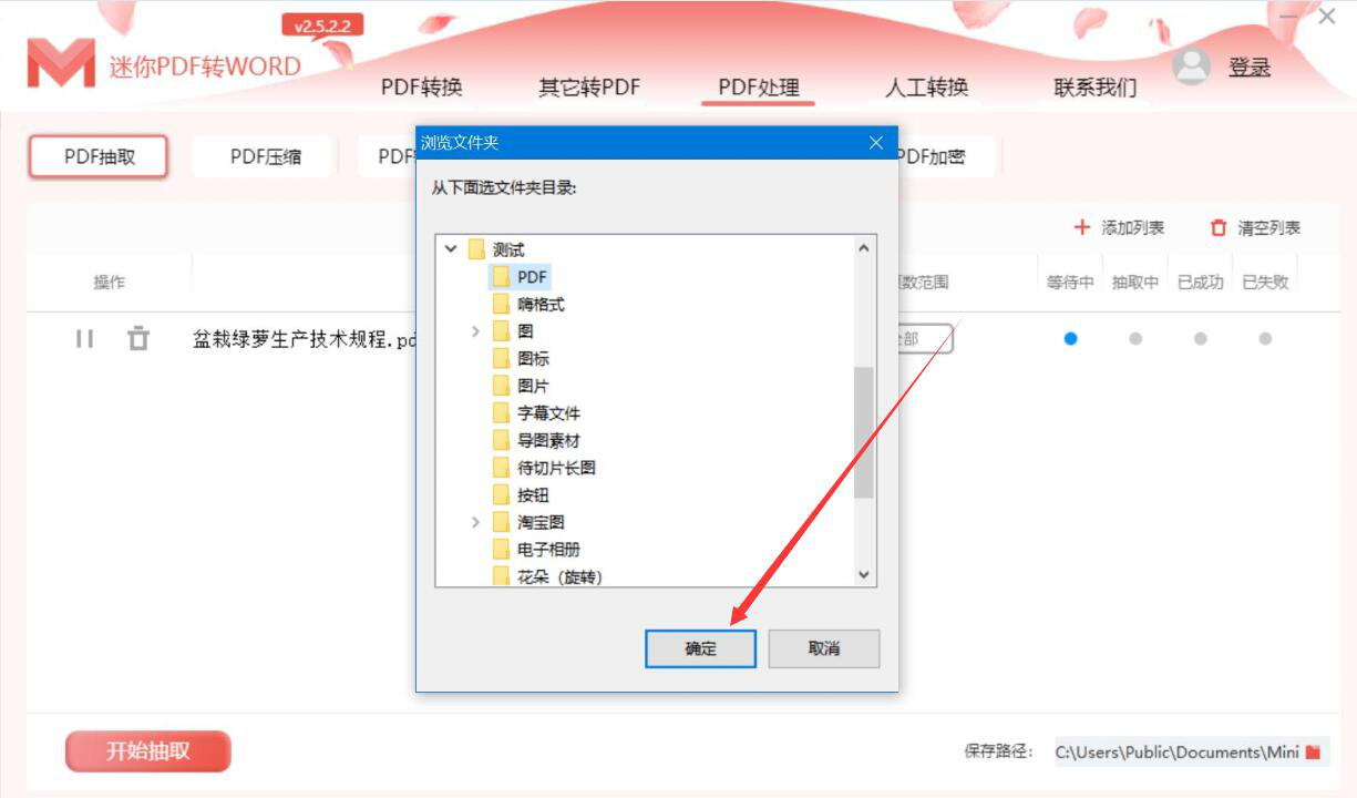 6、接下来,在迷你PDF转Word软件弹出的窗口中,我们选择抽取了页面的PDF文件的保存路径,再点击“确定”按钮。
