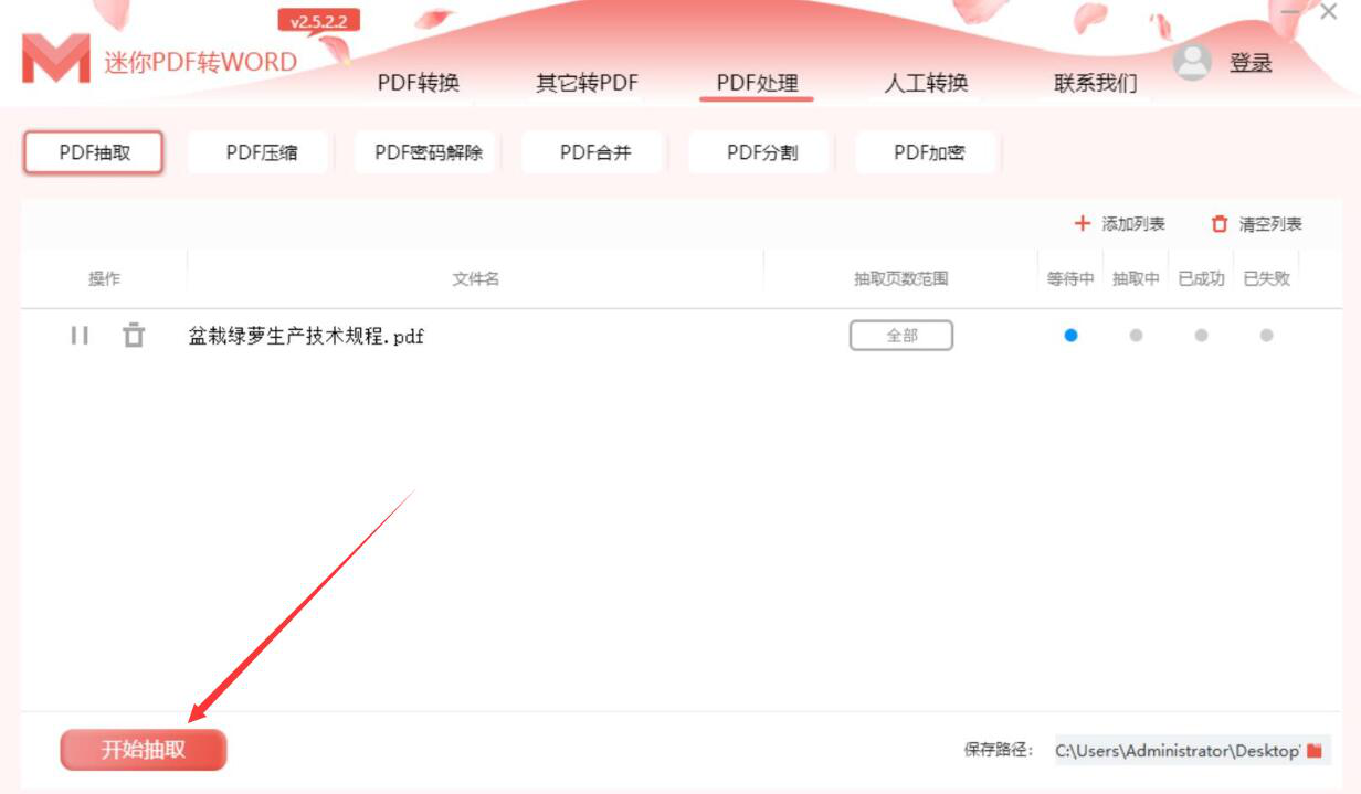 7、最后,我们点击界面左下方的“开始抽取”按钮,迷你PDF转Word软件便开始抽取PDF文件页面。