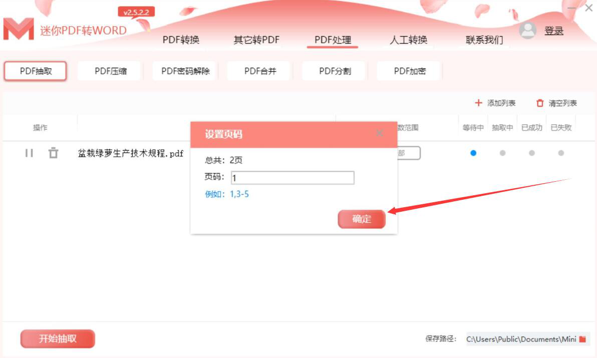 4、此时,迷你PDF转Word软件便会弹出设置页码的窗口。我们在页码中输入想要抽取的PDF页面,再点击“确定”按钮。