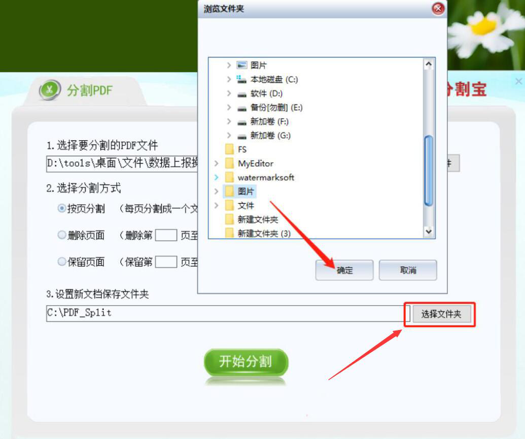 5、如果被分割后的PDF文件的保存路径需要更改,点击“选择文件夹”按钮,并在分割宝弹出的窗口中,选择PDF分割后的保存路径,再点击“确定”按钮。