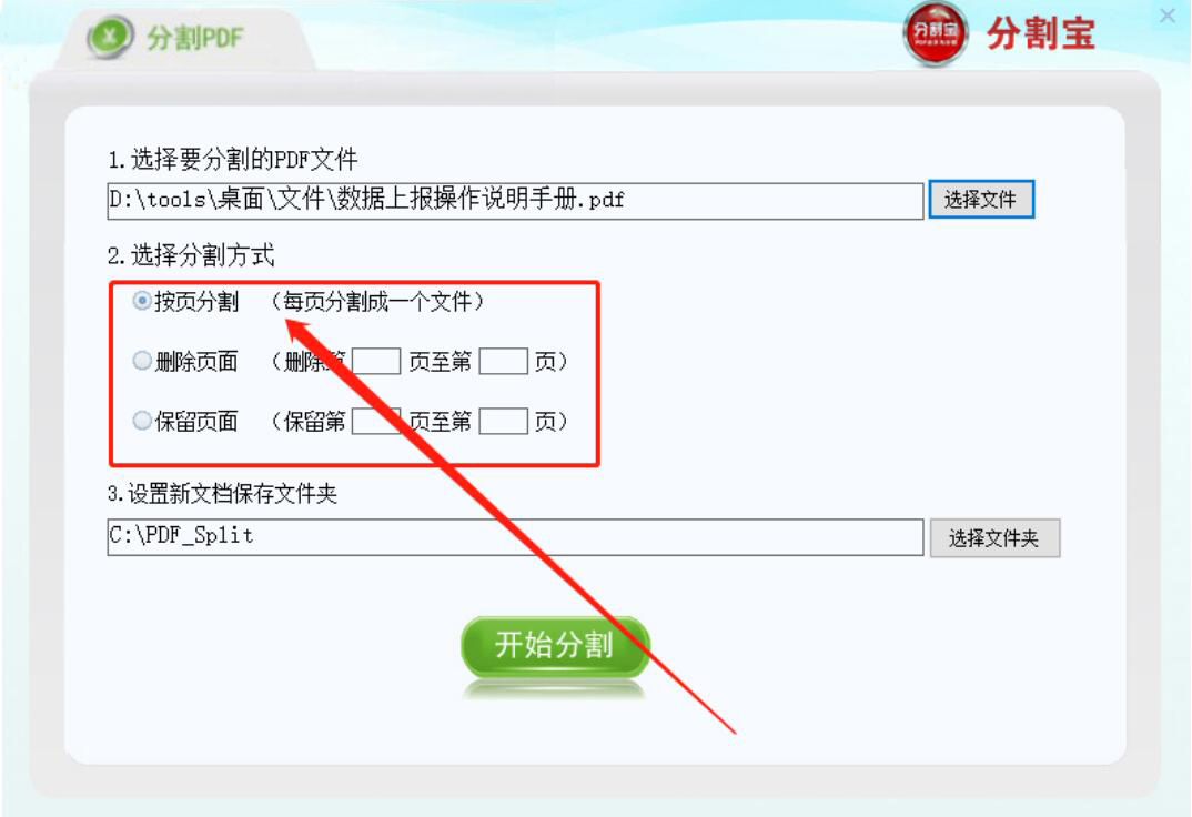 4、接下来,我们根据自己的实际需要来选择分割宝分割PDF的方式,这里选择的是按页分割,意思就是说将每一页单独分割成一个PDF文件。