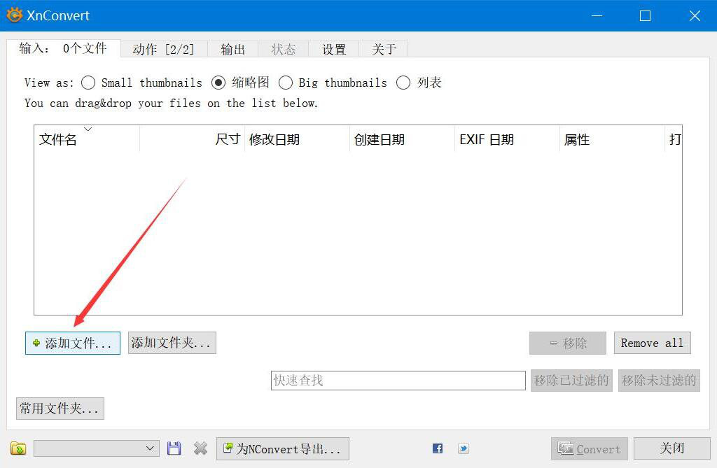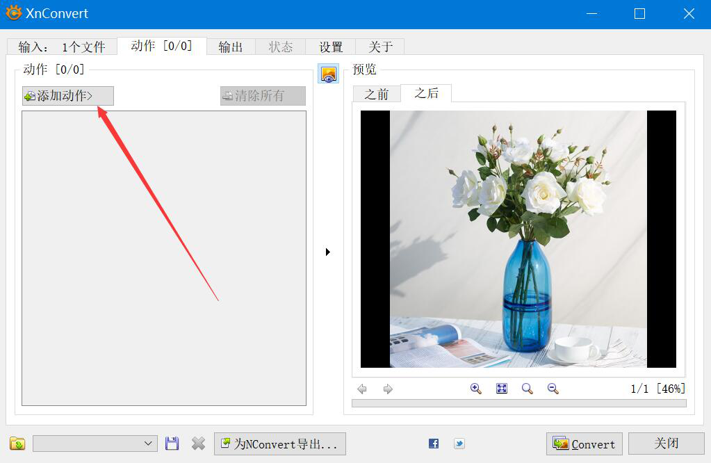 3、然后,我们切换至XnConvert的“动作”操作界面,点击界面中的“添加动作”按钮。