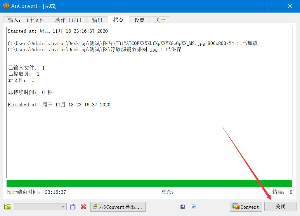9、最后,在“状态”界面中可以看到给图片添加浮雕滤镜效果的图片已经成功被XnConvert保存起来了。我们直接点击“关闭”按钮即可。