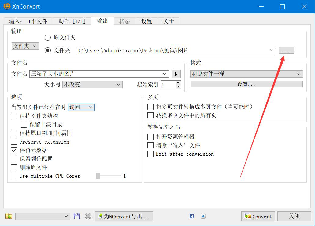 6、我们接着切换至XnConvert的“输出”操作界面。如果添加了浮雕滤镜效果的图片的输出路径要更改,就点击如下图的“…”按钮。