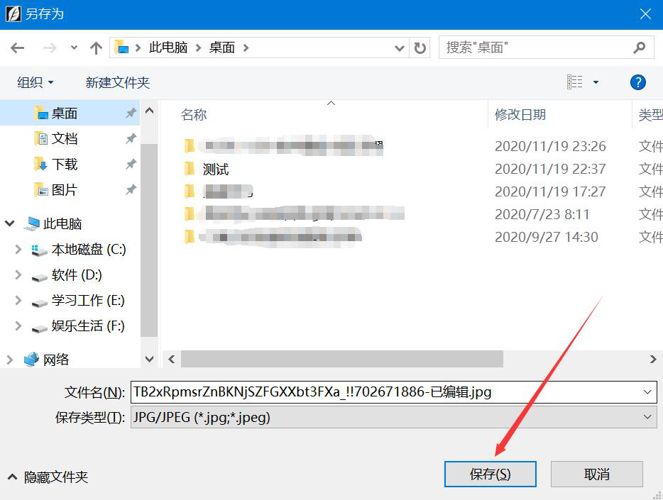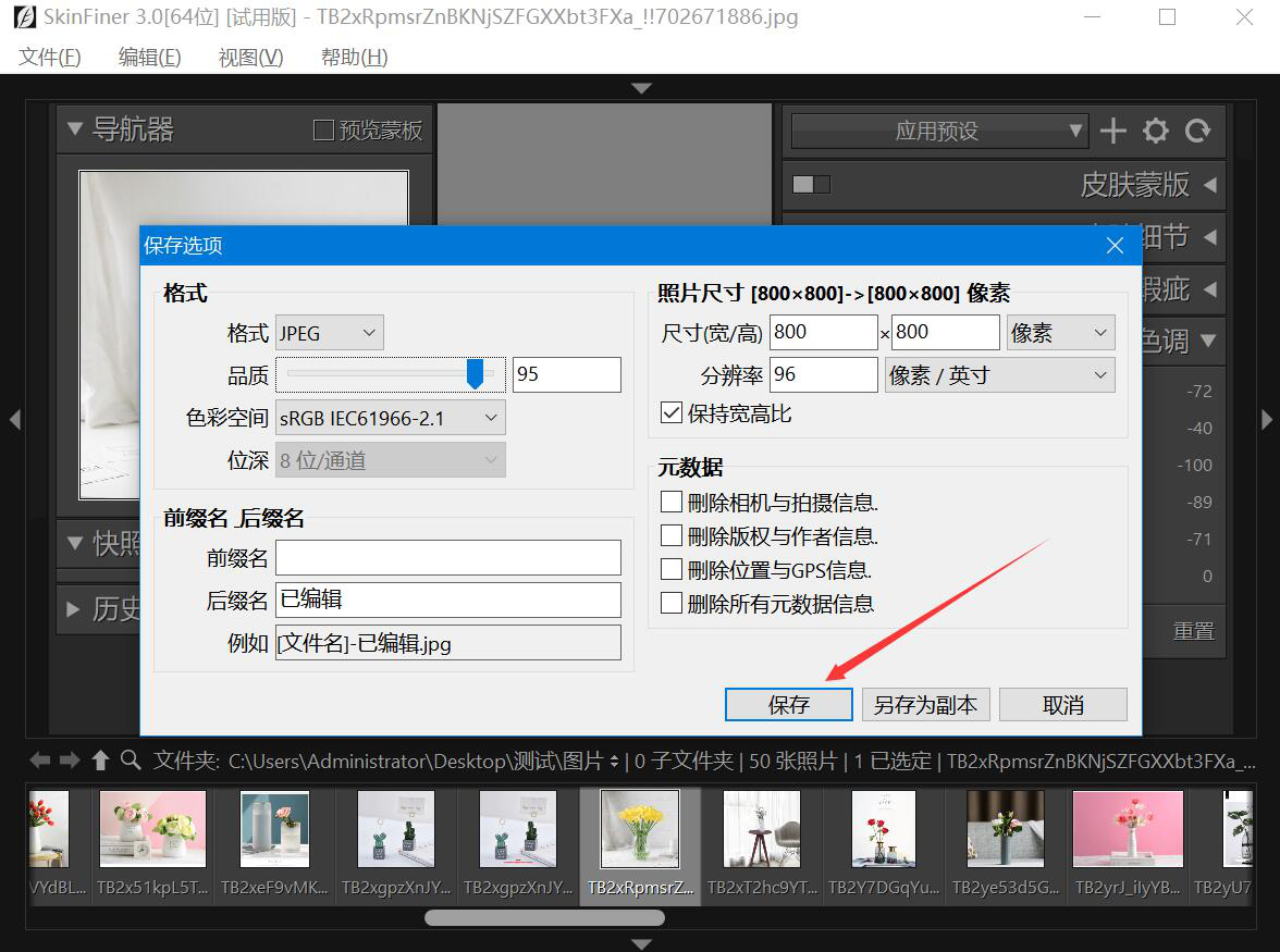 7、最后,在弹出的另存为窗口中,我们选择调整饱和度后的图片的保存路径,再点击“保存”按钮,SkinFiner便会将调整好饱和度的图片给保存到指定的路径中。