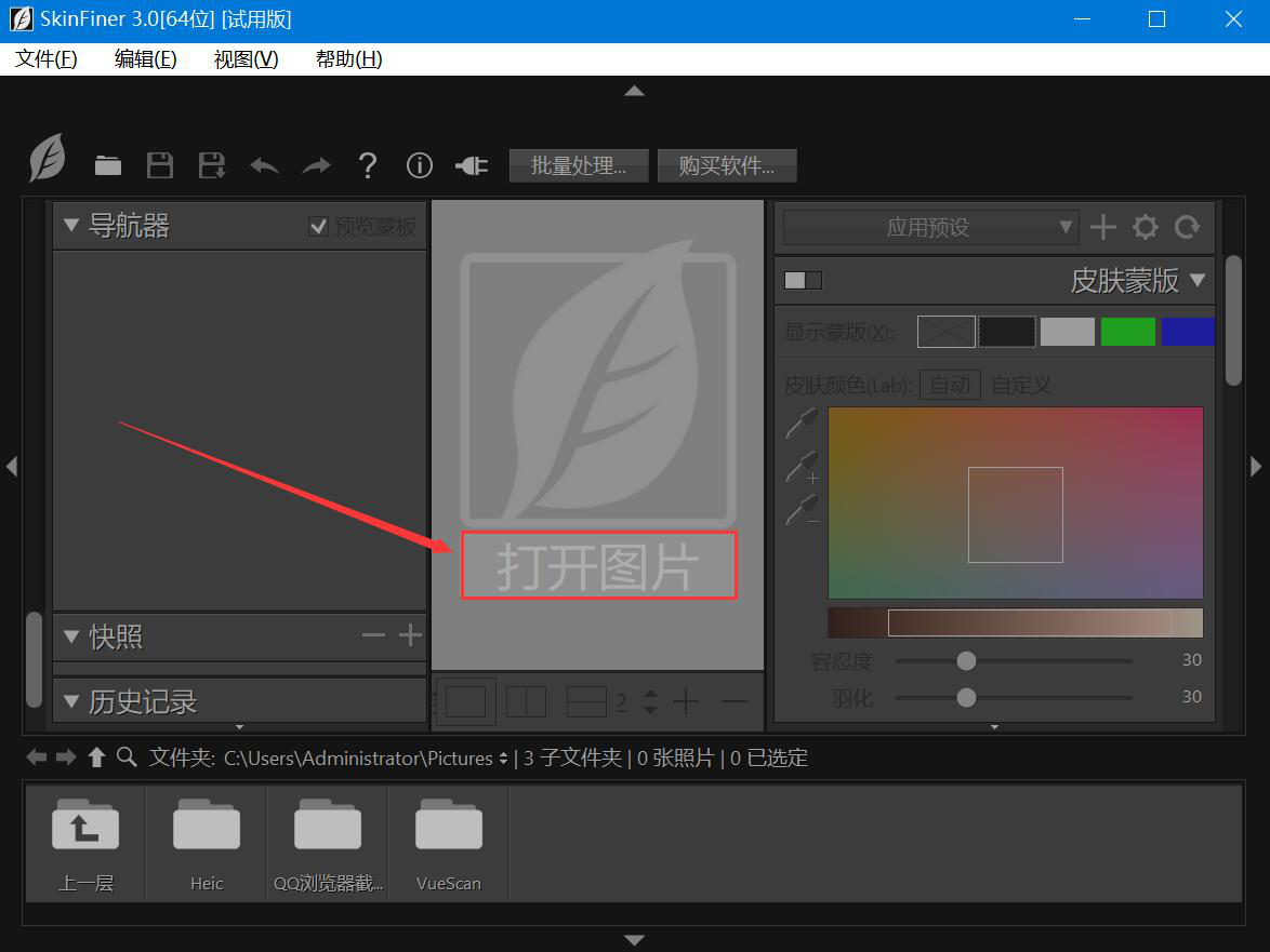 1、首先,我们进入SkinFiner操作界面,点击界面中部的“打开图片”按钮。