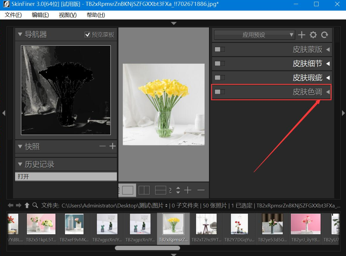 3、然后,回到SkinFiner操作界面。要调整图片的饱和度,就在界面右侧点击“皮肤色调”这项功能。