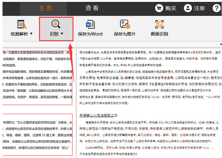 图片导入其中,进入主页,然后在菜单栏点击【面解析】选项,软件就会自动解析图片里的文字段落,