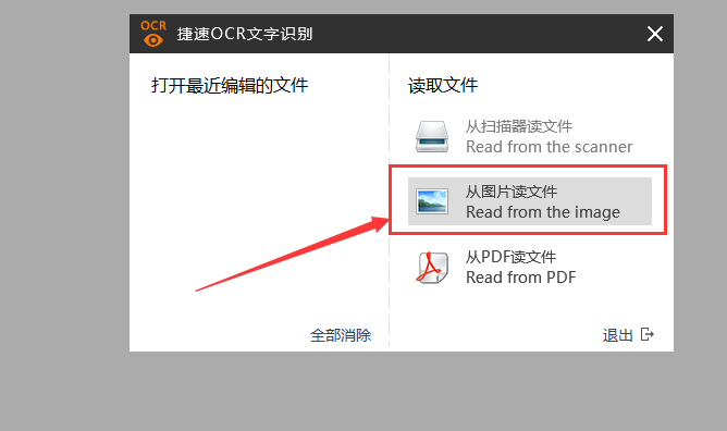 下载安装捷速OCR文字识别软件,运行软件,进入界面,点击【从图片读文件】选项,导入图片,