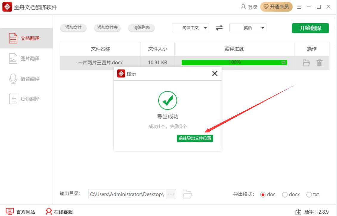 8、最后,如果弹出如下图的窗口提示,则说明金舟文档翻译软件成功地将文档翻译成英文了。我们点击“前往导出文件位置”按钮,即可快速查看翻译好的英文文档了。