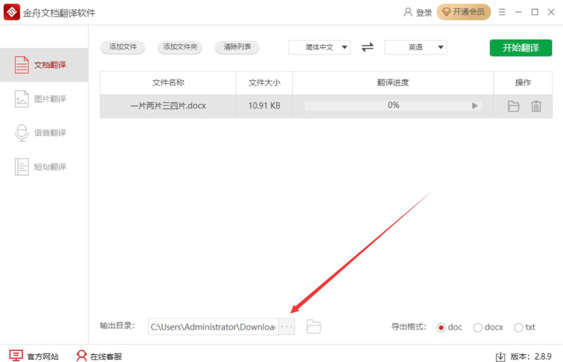 3、然后,回到金舟文档翻译软件的文档翻译操作界面,从界面顶部可以看到翻译的语种,我们设置为简体中文翻译成英语,如下图所示。