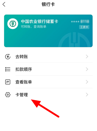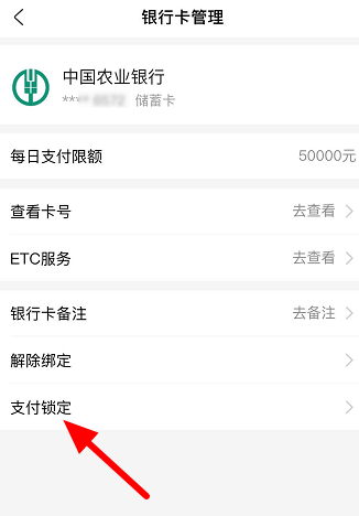 打开银行卡管理页面,点击【卡管理】选项,跳转至新的页面,点击【支付锁定】,