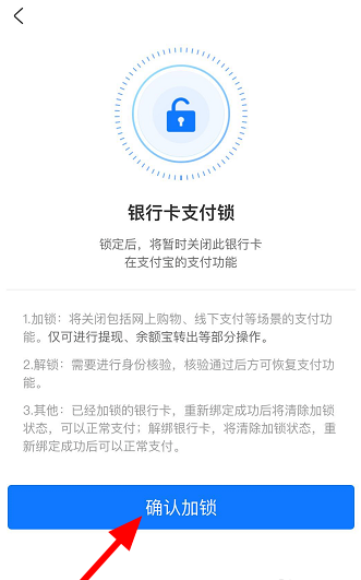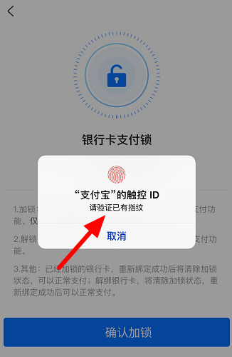 如图,点击【确认加锁】,验证指纹或输入密码,即可设置银行卡支付锁。