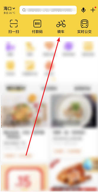 在手机中打开美团APP,进入界面,点击上方【骑车】服务功能,