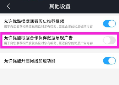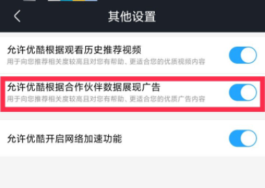 进入设置界面,点击【其他设置】,如图,软件默认开启【允许优酷根据合作伙伴数据展现广告】服务,