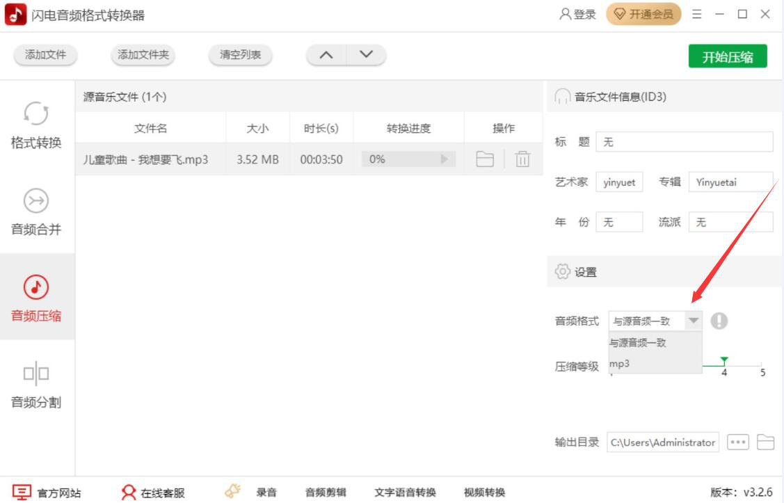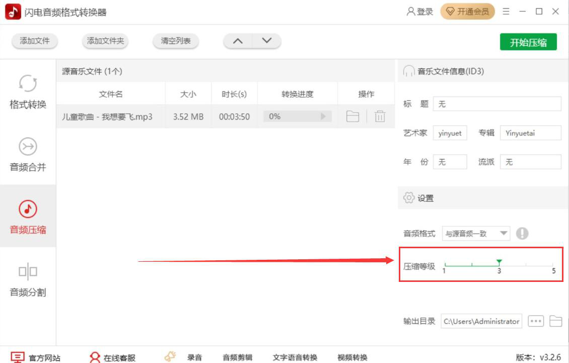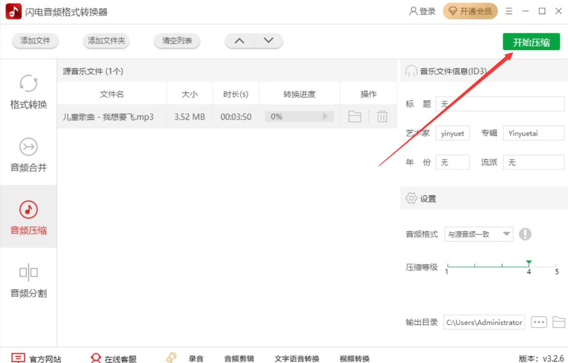 7、音频压缩的格式、等级、路径都设置好了后,我们点击界面右上方的“开始压缩”按钮,闪电音频格式转换器便开始压缩音频。