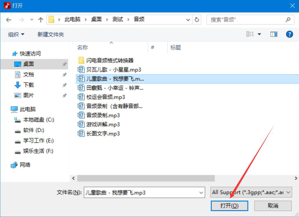 2、然后,在弹出的窗口中,我们选择需要闪电音频格式转换器压缩的音频文件,并点击“打开”按钮。