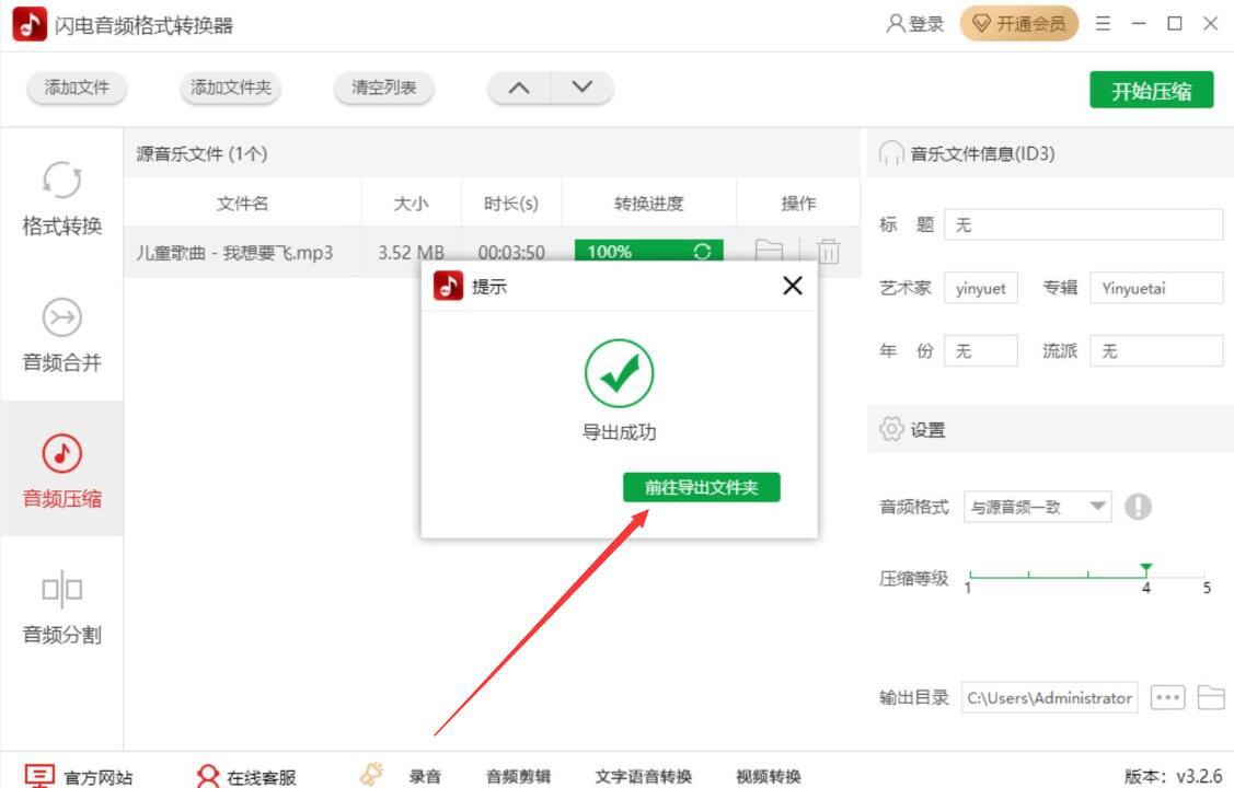 8、最后,如果弹出如下图的窗口提示,则说明闪电音频格式转换器成功地压缩了音频。我们点击“前往导出文件夹”按钮即可快速找到被压缩后的音频。