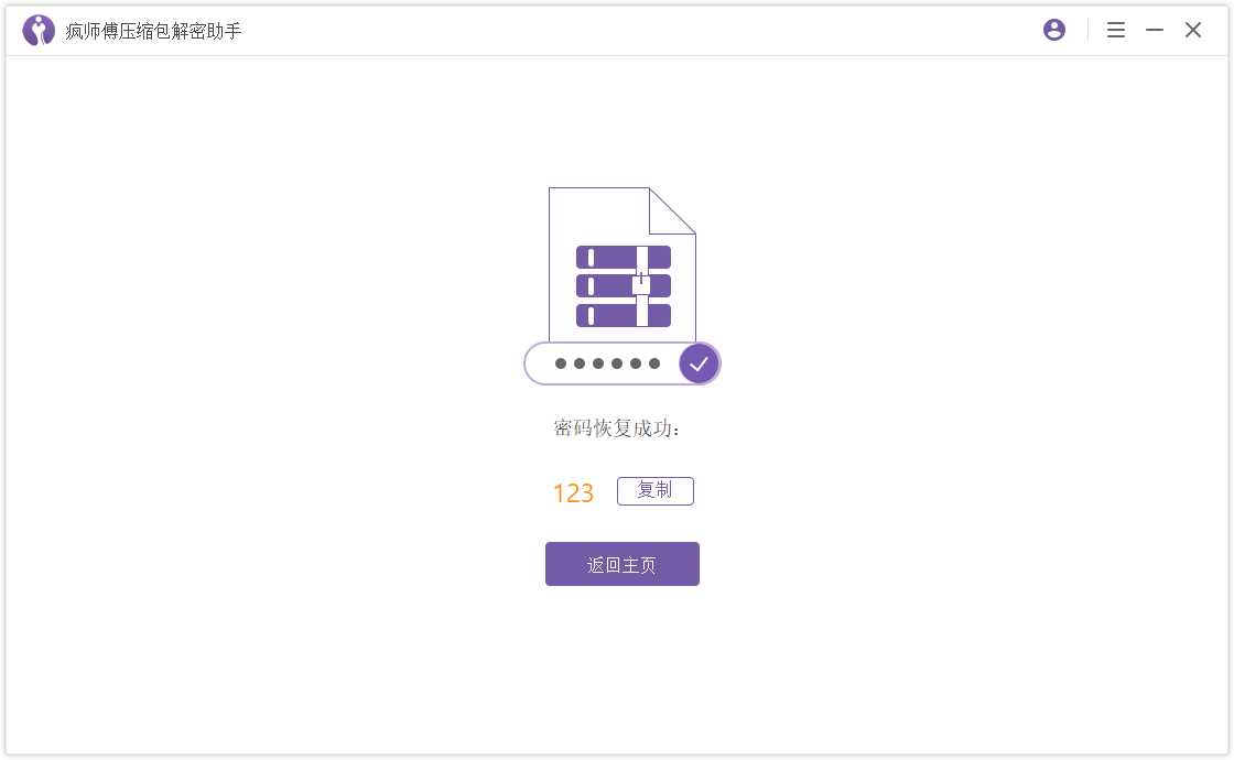 确认密码信息,点击【恢复】按钮,软件就会开始破解文件密码,密码找回之后,将会显示在软件界面上,这时可以点击【复制】,复制密码来解锁压缩包文件。