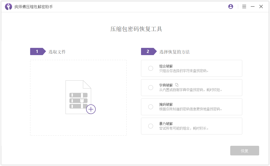 首先下载安装疯师傅压缩包解密助手,运行软件,进入界面,如图,点击【+】,导入需要解密的压缩包文件,然后选择密码破解方式,本文介绍的是【组合破解】模式,点击【下一步】,