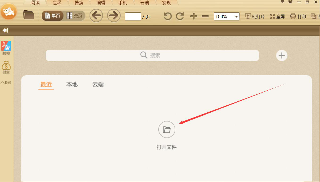 1、首先,我们打开极速PDF阅读器的操作界面,点击界面中部的“打开文件”按钮。