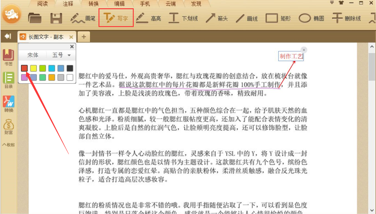 7、接下来,我们可以继续给PDF文件添加注释文字,点击极速PDF阅读器工具栏中的“写字”工具,并设置好颜色,再在目标位置单击一下,便会出现如下图的文本框,我们直接输入注释内容即可。