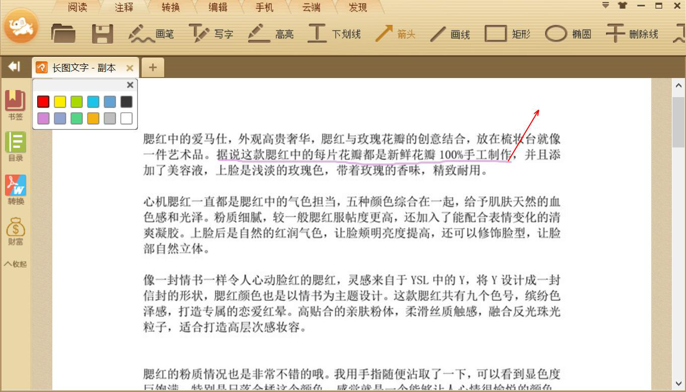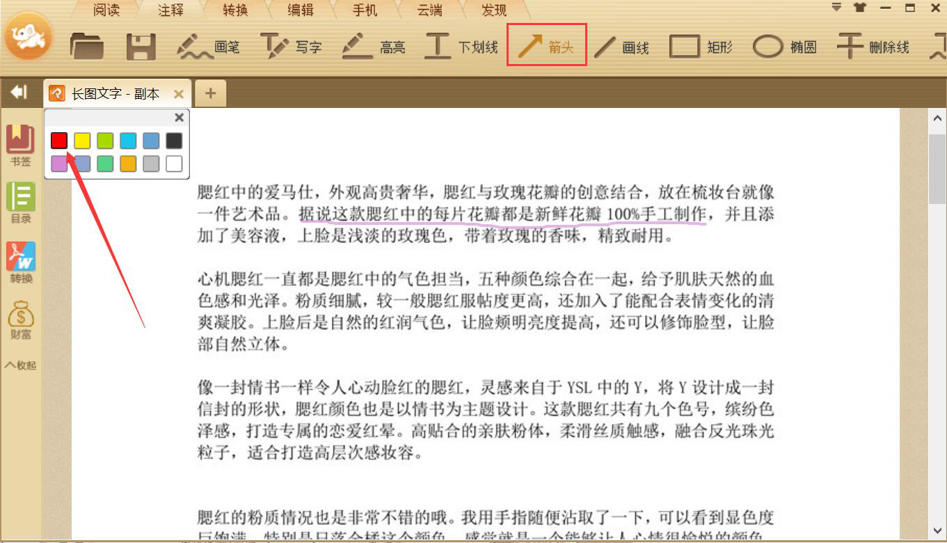 5、当然了,在给PDF文件添加注释时,有些人还会想添加一些箭头和注释的文字,点击极速PDF阅读器工具栏中的“箭头”,并选择箭头的颜色。