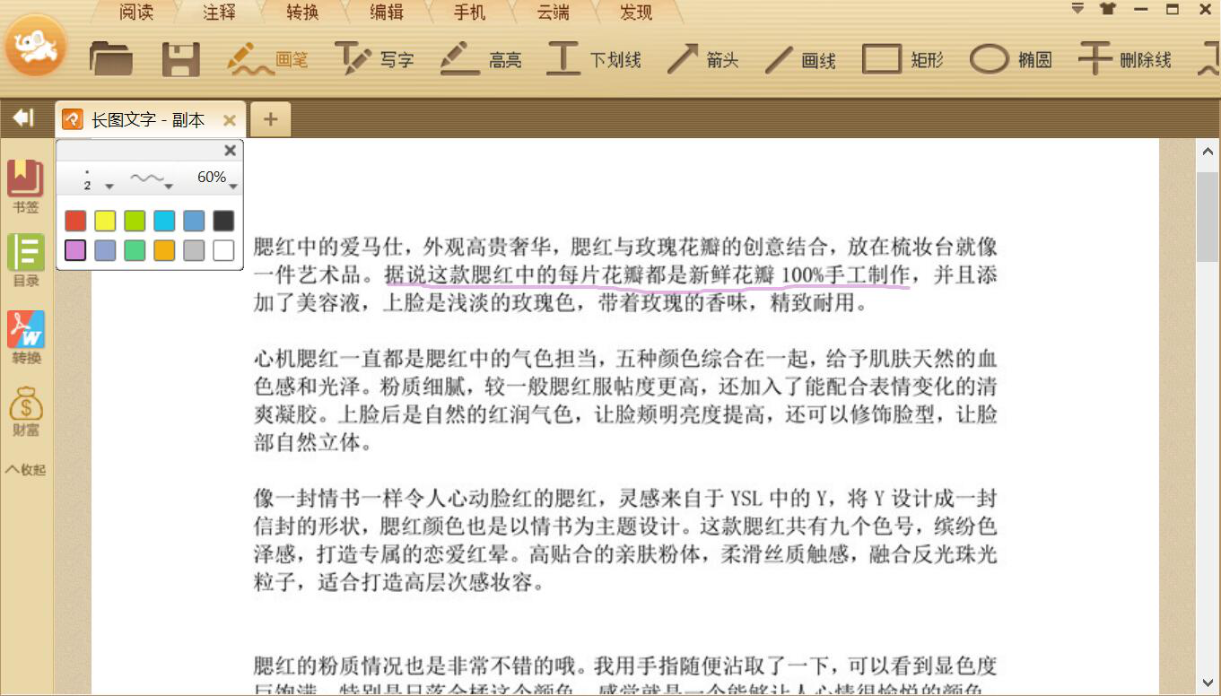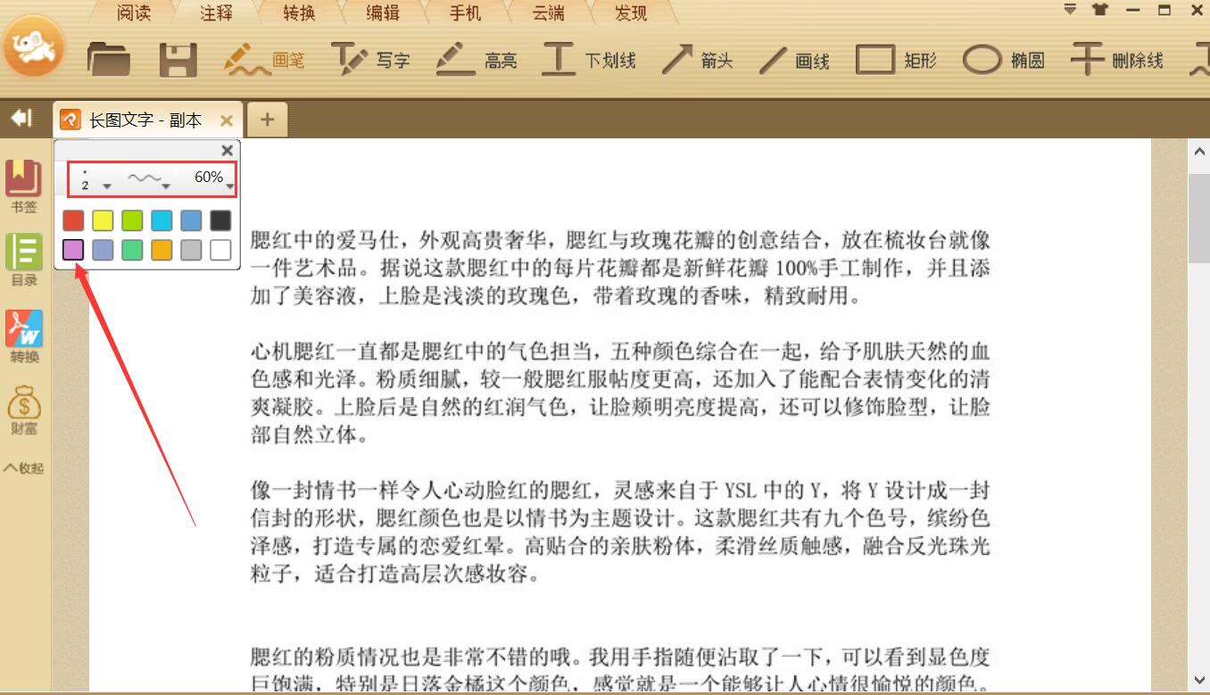 4、按住鼠标左键,在PDF文件需要添加注释的地方开始画,如下图,画出的紫色曲线,便是我们用极速PDF阅读器给PDF文件添加的注释。