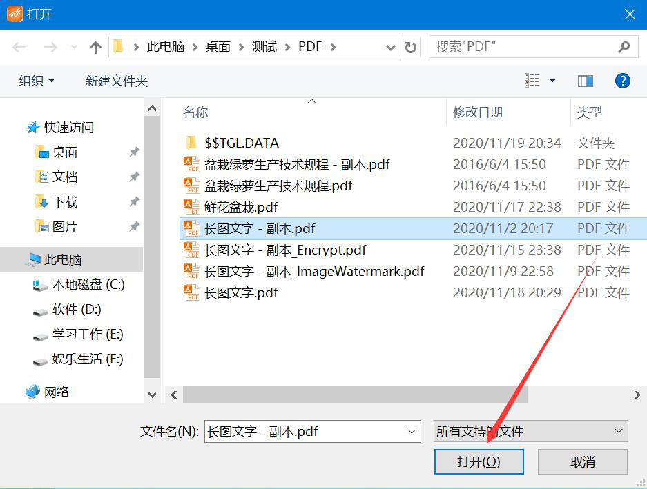 2、在弹出的窗口中,将需要添加注释的PDF文件选中,并点击“打开”按钮,将其导入极速PDF阅读器。