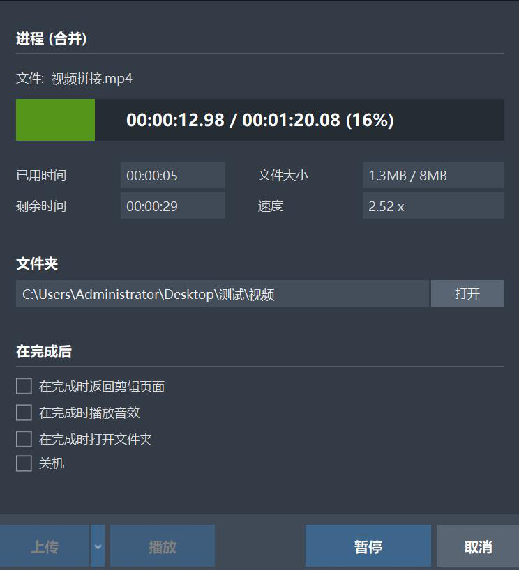 8、接着,我们便可以在Bandicut中实时看到视频拼接的进度。