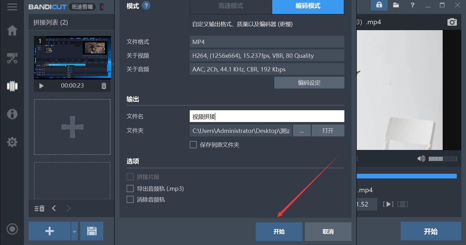 7、视频拼接的格式、质量、名称、路径都设置好了后,我们点击Bandicut导出设置窗口中的“开始”按钮。