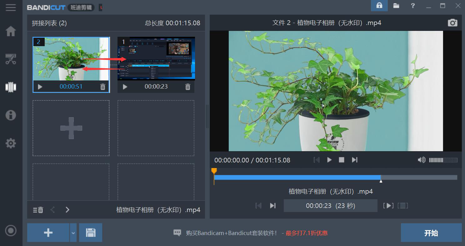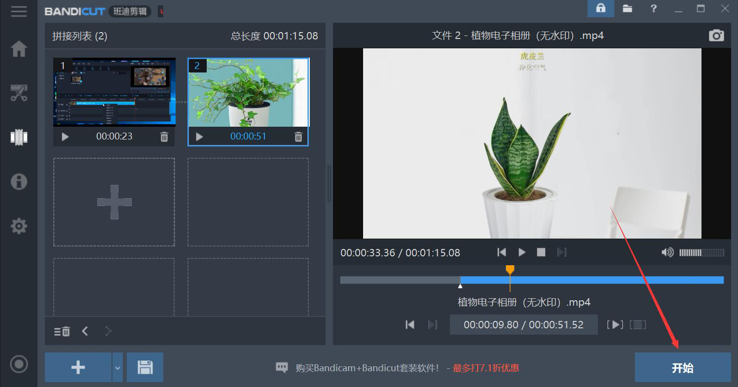 4、视频拼接的顺序设置好了后,我们点击Bandicut界面右下方的“开始”按钮。