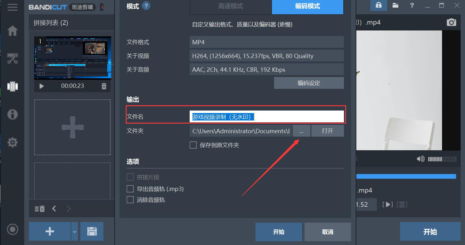 5、此时,Bandicut会弹出输出设置窗口。我们可以设置视频拼接后输出的文件名。如果输出的路径要更改,就点击如下图的“…”按钮。