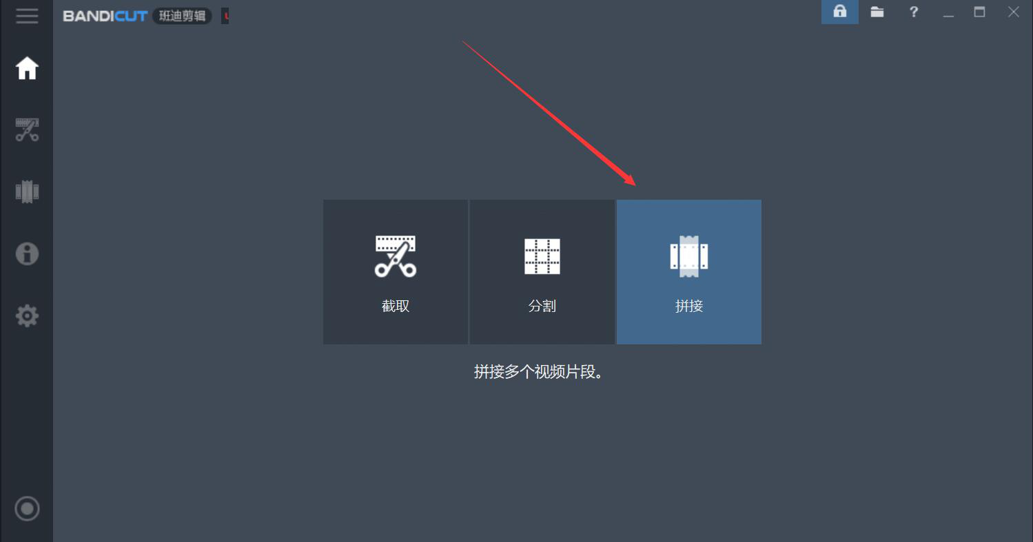 1、首先,我们打开Bandicut软件,点击界面中部的“拼接”按钮,从而进入Bandicut拼接视频文件的操作界面。