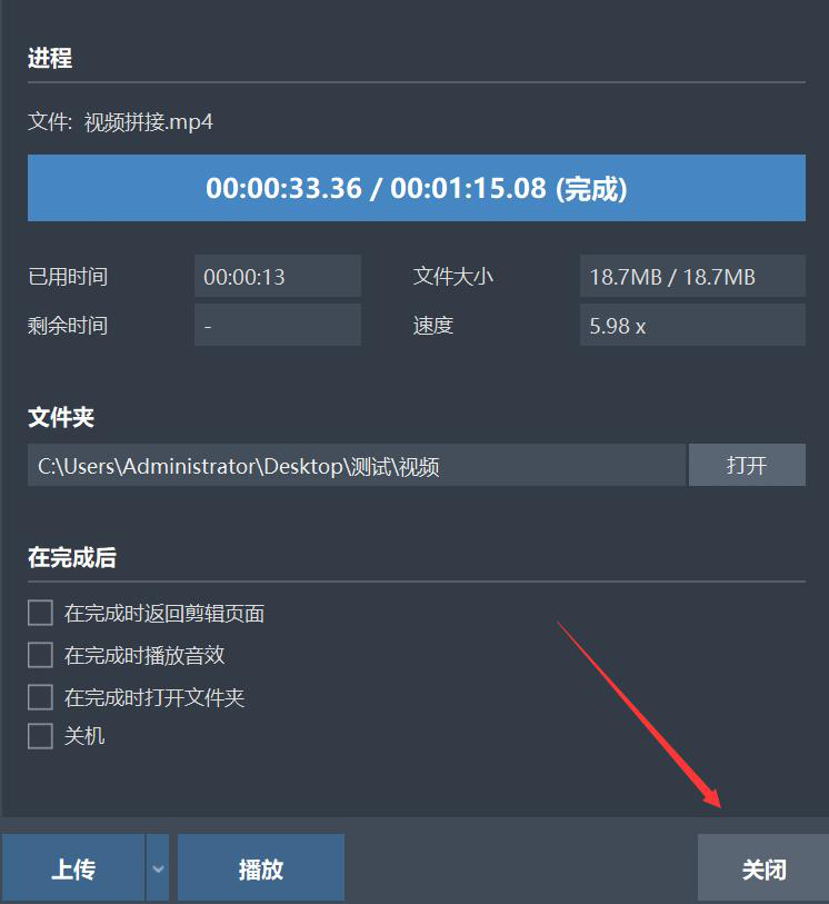 9、最后,当进度中显示“完成”,则说明Bandicut完成了视频的拼接,我们直接点击“关闭”按钮即可。