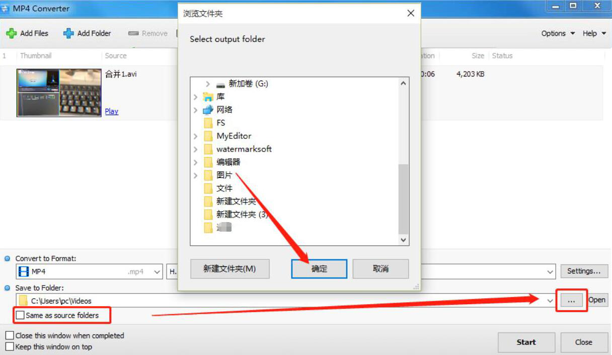 4、如果AVI转MP4默认的输出目录需要更改,就点击如下图的“…”按钮,Tomabo MP4 Converter会弹出浏览文件夹的窗口,我们选择AVI转MP4后的保存路径,再点击“确定”按钮。